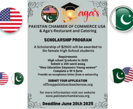 PAKISTAN CHAMBER OF COMMERCE USA & AGA’S RESTAURANT LAUNCH SCHOLARSHIP PROGRAM FOR YOUNG WOMEN